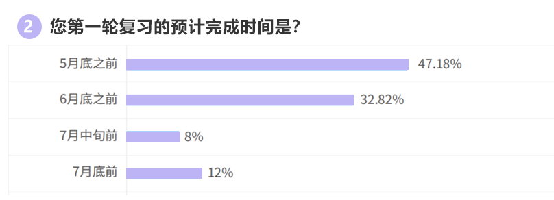 從第一輪復(fù)習(xí)的數(shù)據(jù)來看,有80%的考生會(huì)在6月底之前完成中級(jí)會(huì)計(jì)第一輪的復(fù)習(xí)計(jì)劃,甚至有近半的考生會(huì)在五月底之前就完成第一輪的復(fù)習(xí)。