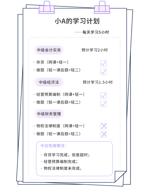 例如:小A計(jì)劃四月份開始備考中級(jí),一年過三科,她的某天的學(xué)習(xí)計(jì)劃如下。