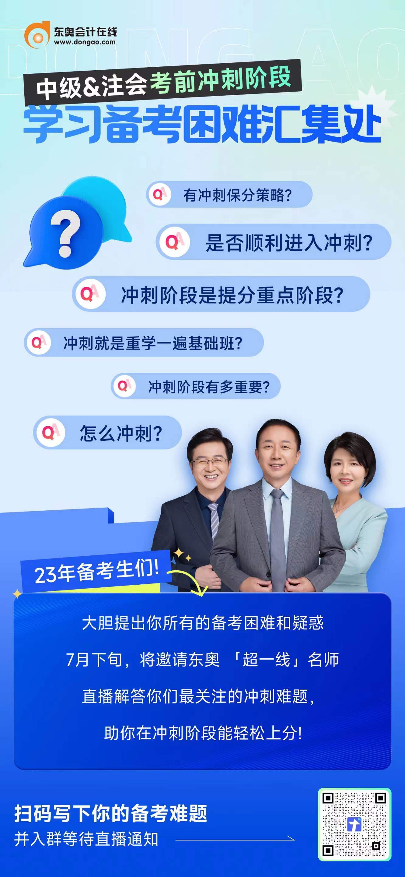 2023年中級(jí)會(huì)計(jì)師備考時(shí)間所剩不多,沖刺階段如何提分?備考陷入“僵局”,一肚子問(wèn)題不知道該問(wèn)誰(shuí)?別慌!7月下旬,東奧邀請(qǐng)中級(jí)會(huì)計(jì)名師,直播解答考生們目前最關(guān)注的沖刺難題,助力大家在沖刺階段能順利上分!趕緊掃描下圖中的二維碼,寫下你的備考難題,等待老師解惑吧!