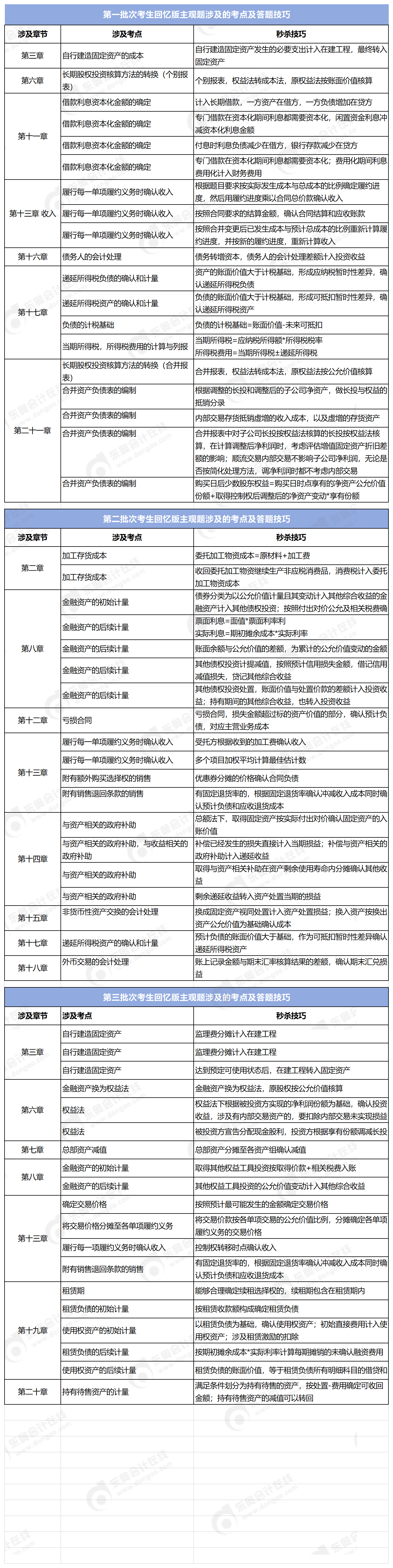 三個(gè)批次的主觀題都對(duì)于第十三章收入的內(nèi)容進(jìn)行了重點(diǎn)考查,各批次中分值達(dá)到10分以上的章節(jié)有:第六章、第八章、第十三章、第十四章、第十七章、第十九章以及第二十一章。尤其是第二十一章的單批次分值達(dá)到了15分。