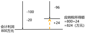 【答案解析】(1)企業(yè)通過具備法定資格的公益性社會組織向災區(qū)捐款100萬元,屬于公益性捐贈支出,該筆捐贈的稅前扣除限額=800×12%=96(萬元),實際捐贈額為100萬元,超過限額,稅前準予按限額扣除96萬元;(2)直接向受災小學的捐款20萬元不得在稅前扣除;(3)納稅調增額=(100-96)+20=24(萬元),該企業(yè)2020年度應納稅所得額=800+24=824(萬元),參考下圖: