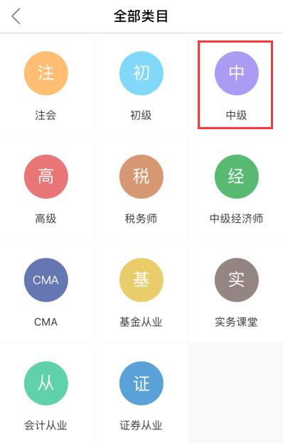 a. 點擊底部左側(cè)【首頁】按鈕,點擊左上角【選考種】后,在全部類目中選擇【中級】按鈕。