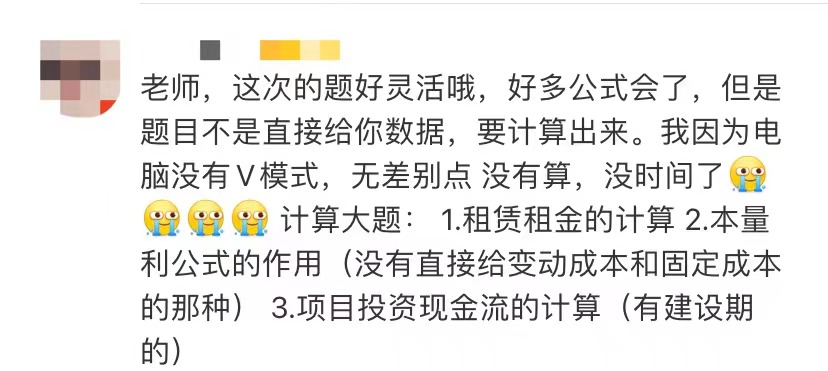 根據(jù)考生的反饋得知,《財務(wù)管理》考查了租賃租金的計算、本量公式的作用、項目投資現(xiàn)金流的計算等內(nèi)容!希望接下來參加考試的考生能夠重視起來,認(rèn)真?zhèn)淇?,爭取學(xué)會、答對!