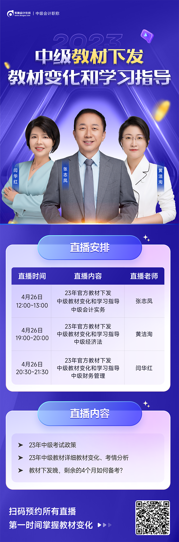 4月26日12:00 | 23年中級教材變化和學(xué)習(xí)指導(dǎo)-中級會計(jì)實(shí)務(wù) | 張志鳳 | 點(diǎn)擊聽課 |