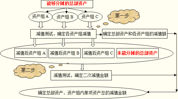首先,在不考慮相關(guān)總部資產(chǎn)的情況下,估計和比較資產(chǎn)組的賬面價值和可收回金額,并按照前述有關(guān)資產(chǎn)組減值測試的順序和方法處理。