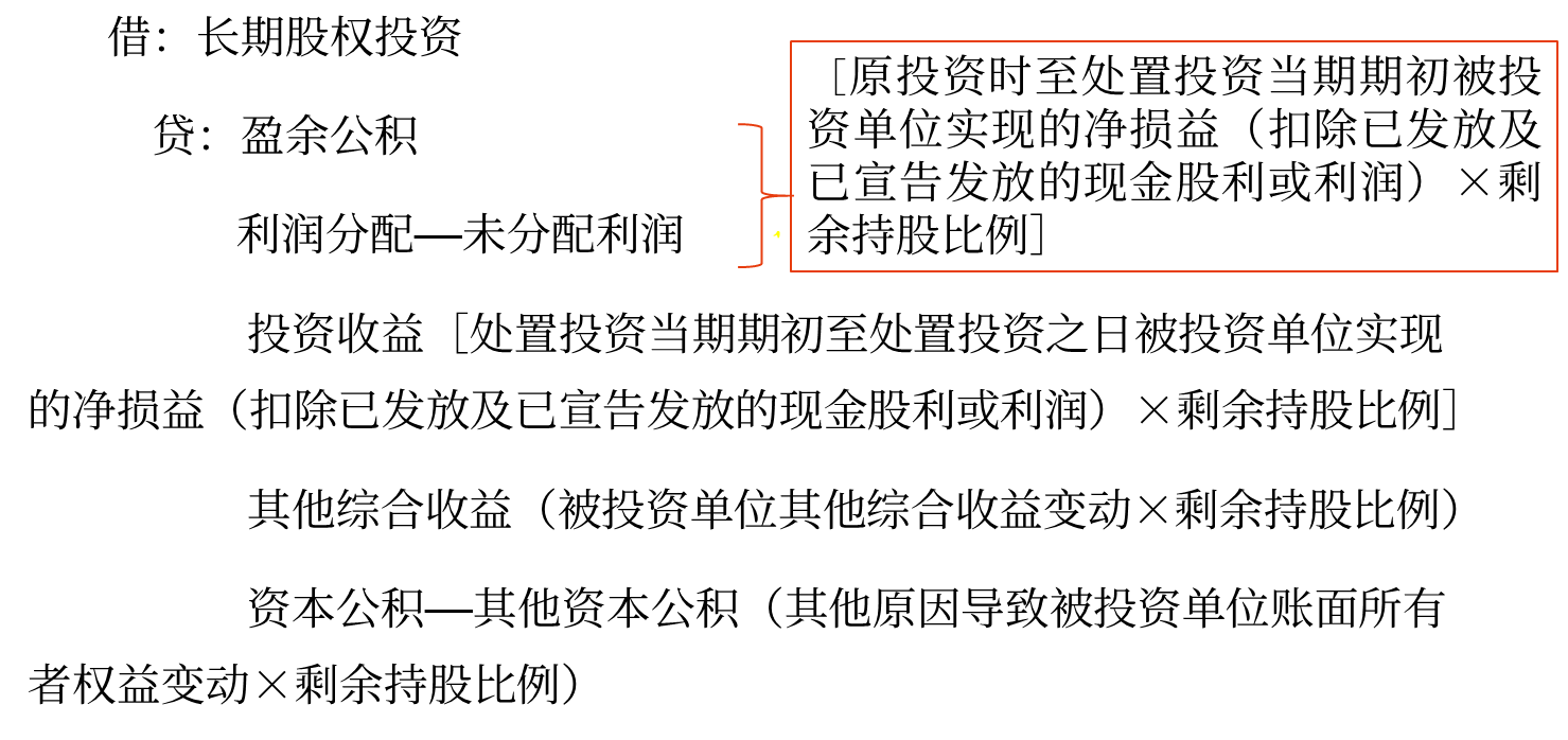 (1)確認(rèn)有關(guān)股權(quán)投資的處置損益 | 借:銀行存款 貸:長(zhǎng)期股權(quán)投資(出售部分股權(quán)賬面價(jià)值) 投資收益(差額,可能在借方) |