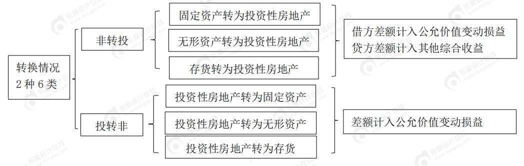 【提示】此處所指非投資性房地產(chǎn),指固定資產(chǎn)(房)、無形資產(chǎn)(地)和房地產(chǎn)開發(fā)企業(yè)的存貨(商品房)。故“非投資性房地產(chǎn)”與“投資性房地產(chǎn)”之間的轉(zhuǎn)換分2類共6種情況。