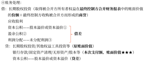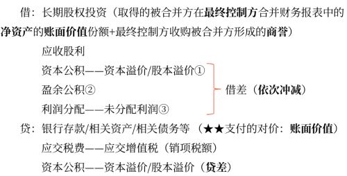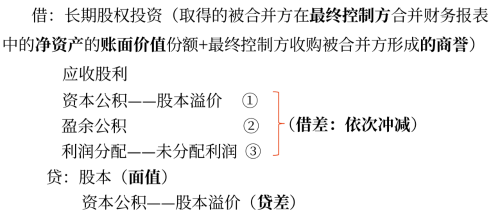 基本原則 | 合并方對被合并方的長期股權(quán)投資,其成本代表的是在合并日被合并方在最終控制方合并財務(wù)報表中凈資產(chǎn)的賬面價值的份額(★★★可能包含商譽)。 | |